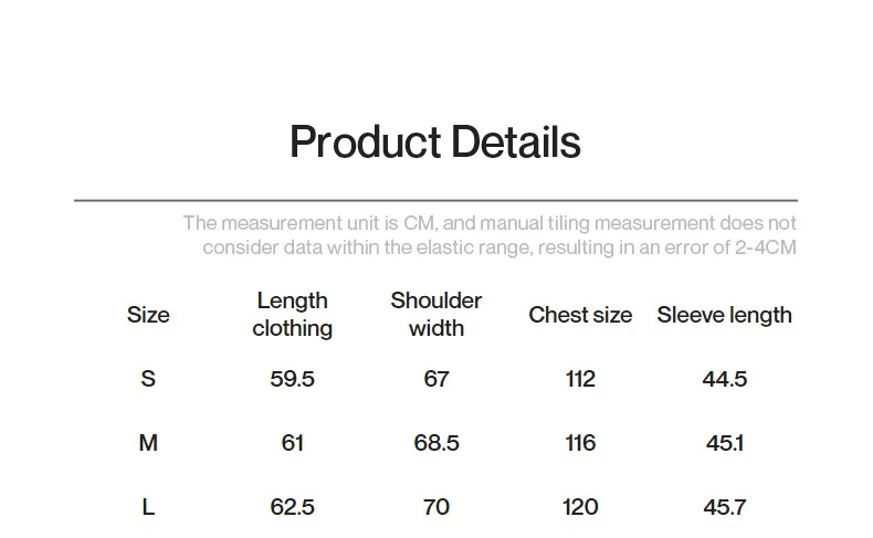 | Size | Length (cm/in) | Shoulder Width (cm/in) | Chest Size (cm/in) | Sleeve Length (cm/in) |