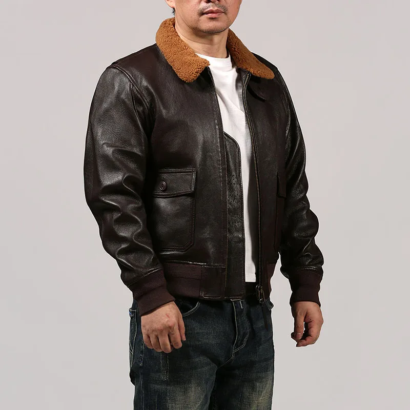 M422A Asian Size Men's Slim Vintage Genuine Cow Leather Wool Collar G1 Jacket