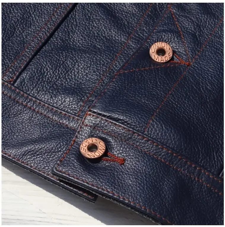 Men’s Blue Genuine Cowhide Leather Jacket – 100% Real Leather, Super Slim Fit, Classic Short Casual Coat, Fashion Outerwear