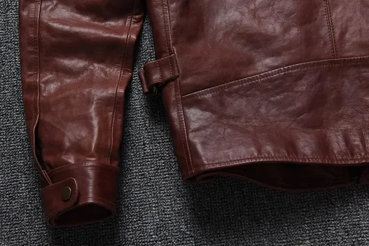 🧥 Crafted from 100% genuine cowhide leather, authenticity guaranteed, this men’s burgundy oil-waxed jacket offers a refined balance between business sophistication and vintage character. The slim-fit cut enhances your physique, while the natural glossy finish of the leather provides an elegant aged tone. Ideal for both casual outings and formal occasions.