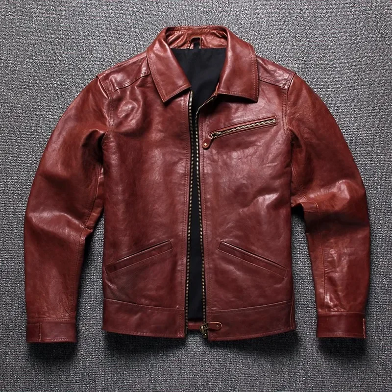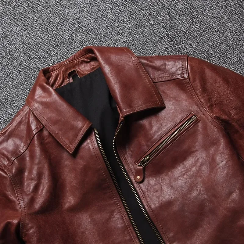 Men’s Burgundy Oil-Waxed Cowhide Leather Jacket – Slim Fit Vintage Business Casual Coat, Premium Quality Genuine Leather Outerwear