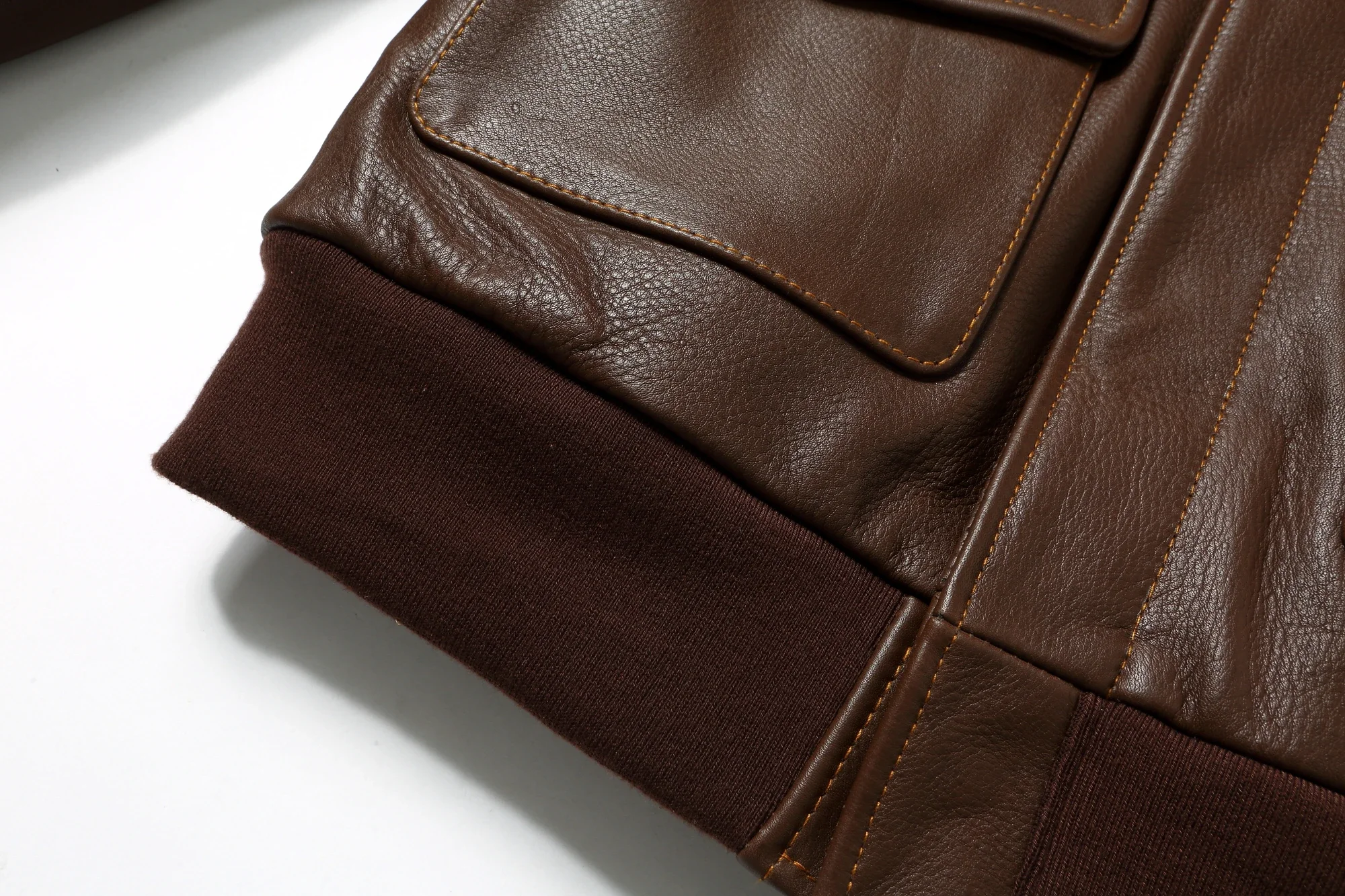 Men’s Classic Brown Genuine Cowhide Bomber Jacket – Top Layer Leather Winter Coat Blouson Cuir Homme