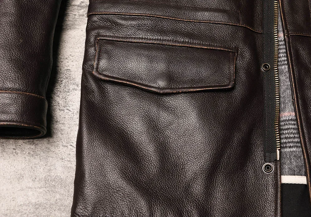 Men’s Classic Genuine Cowhide Leather Jacket – Safari Style Long Hunting Windcoat, Winter Warm Real Leather Outerwear