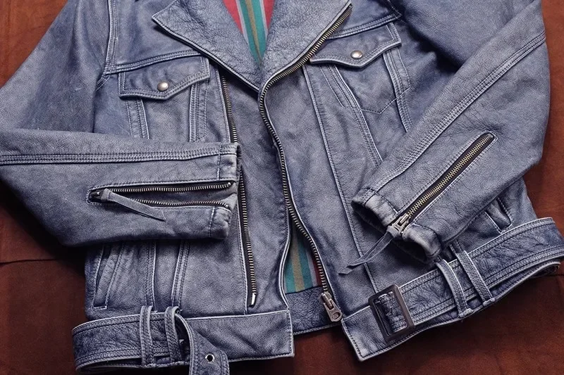 Expertly crafted from 100% genuine cowhide leather, this jacket offers a unique matte denim-blue finish for a bold yet sophisticated biker look.