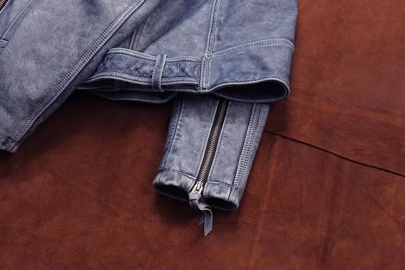 Men’s Classic Motorcycle Leather Jacket – Vintage Denim Blue Real Cowhide Short Biker Coat with Matte Finish
