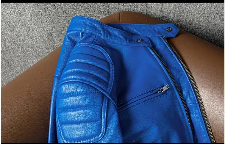 Expertly crafted from 100% genuine cowhide leather, this jacket features a vibrant cool-blue finish with a modern slim silhouette and short-cut rider design. It combines durability, comfort, and bold fashion appeal — perfect for motorcycle enthusiasts and casual wear alike.