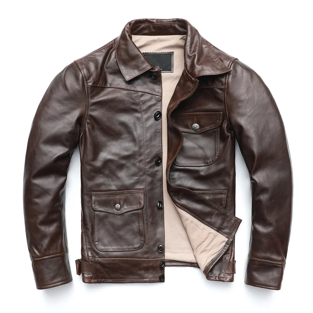 Men’s Dark Brown Cowhide Leather Jacket – Thick Oil-Wax Genuine Leather Winter Coat with Turn-Down Collar