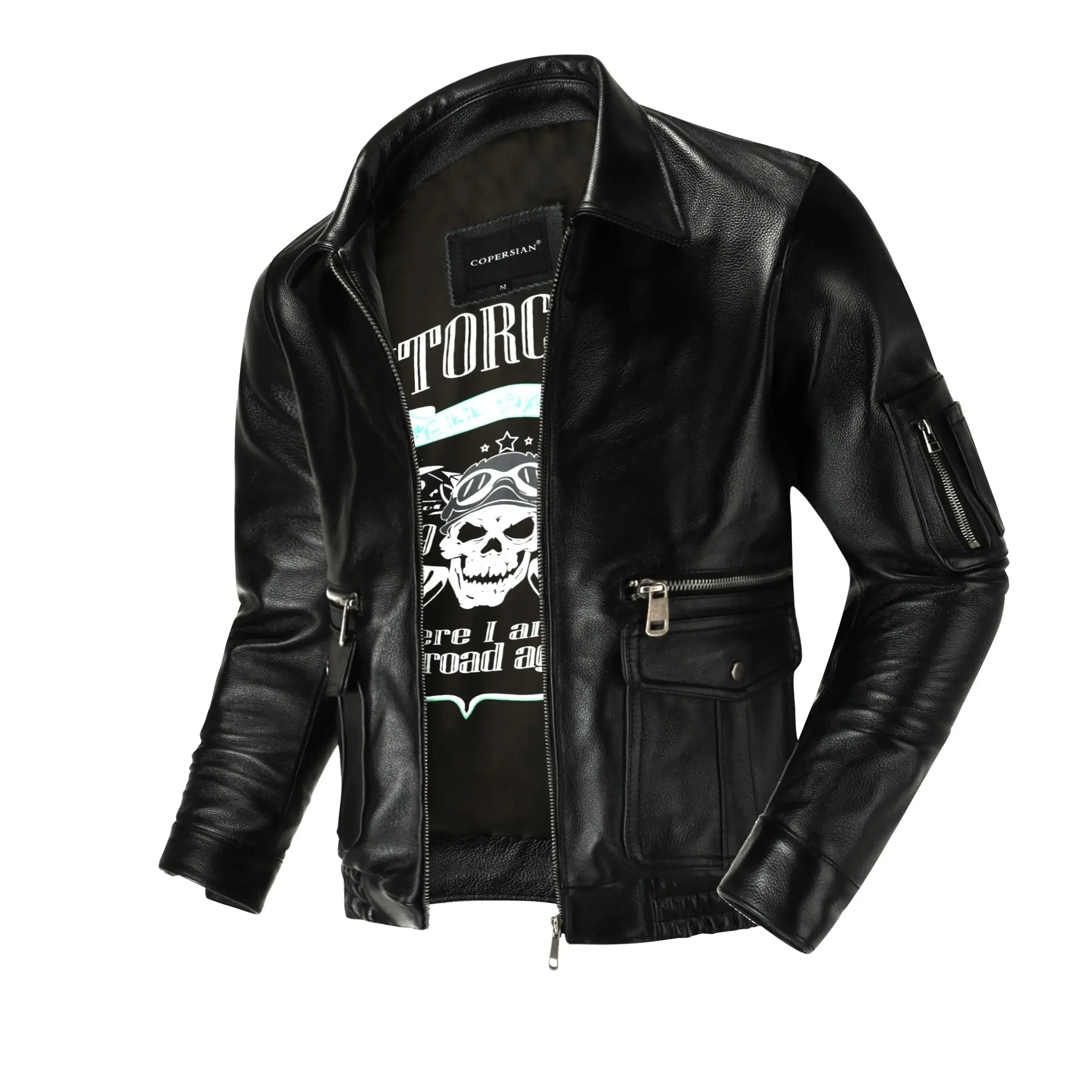 Crafted from 100% genuine cowhide leather, this Air-Force-inspired jacket showcases a short, vintage design with a lapel collar and graphite aged finish for a rugged, masculine look. The durable natural cowhide ensures long-lasting wear while maintaining a soft, comfortable feel. Ideal for riders and vintage fashion enthusiasts alike.