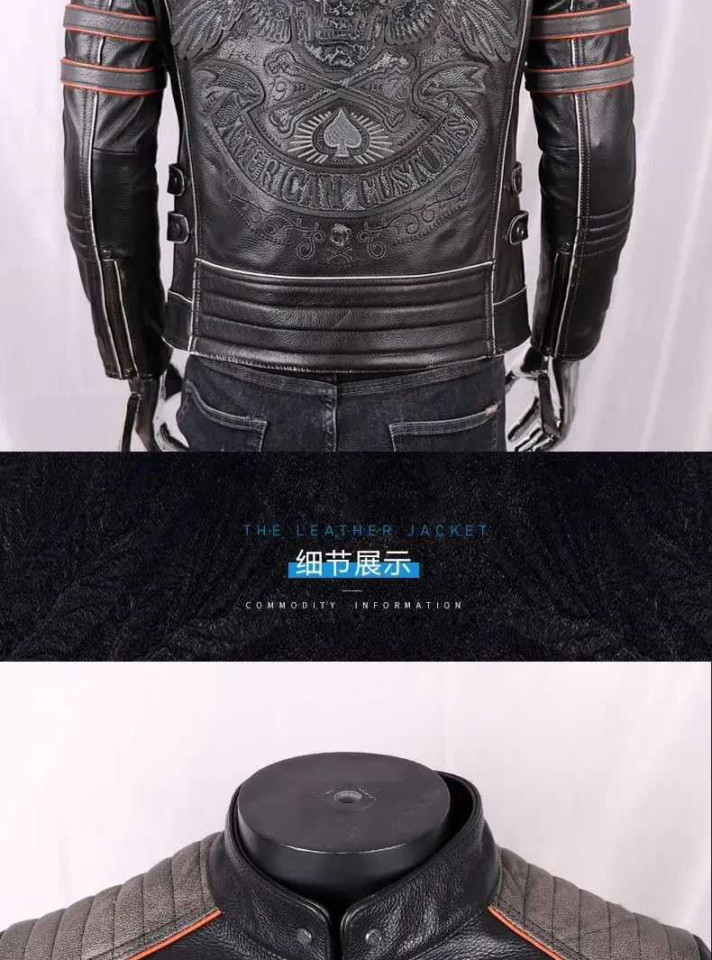 Men’s Genuine Cowhide Leather Motorcycle Jacket Short Stand Collar with Skull Embroidery Harley Style Biker Coat