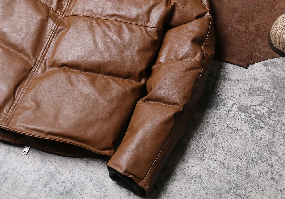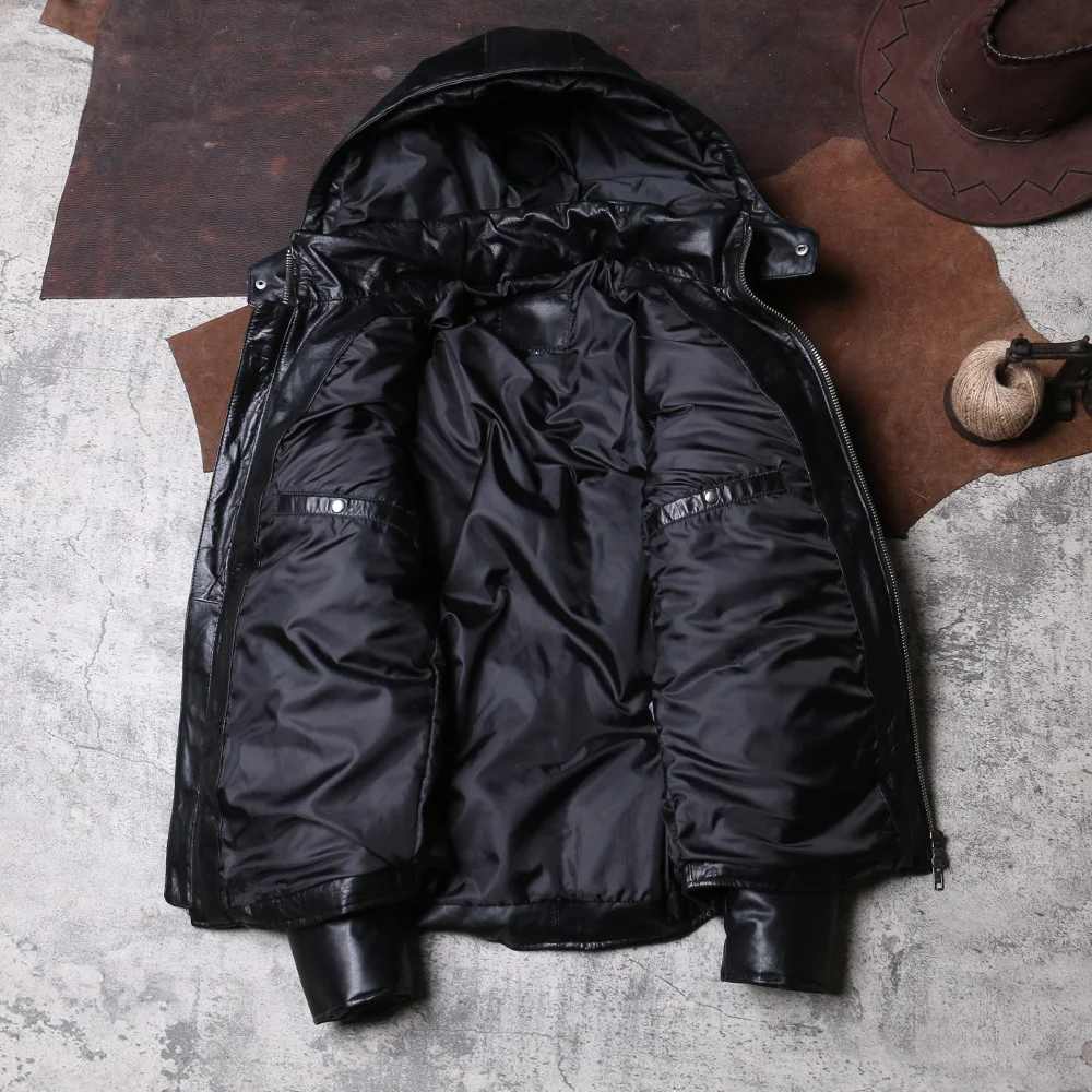🧥 Crafted from 100% genuine cowhide leather, authenticity guaranteed. This men’s high-quality down jacket combines the rugged strength of natural cow skin with plush insulation for ultimate winter warmth. Designed with a classic short silhouette and premium craftsmanship, it’s perfect for casual wear, riding, or cold-weather urban style.