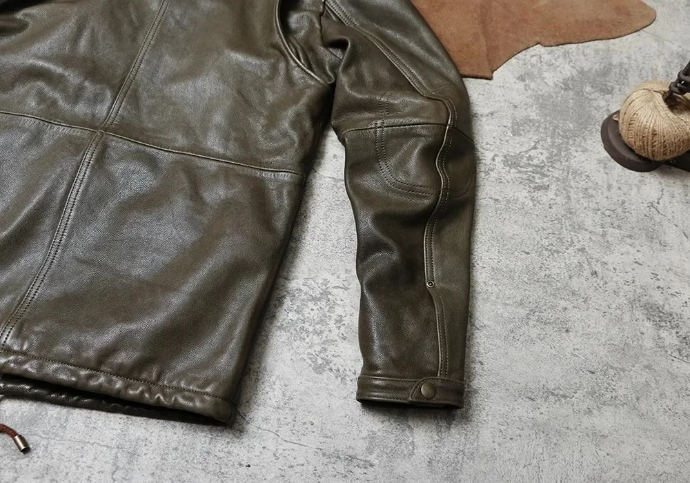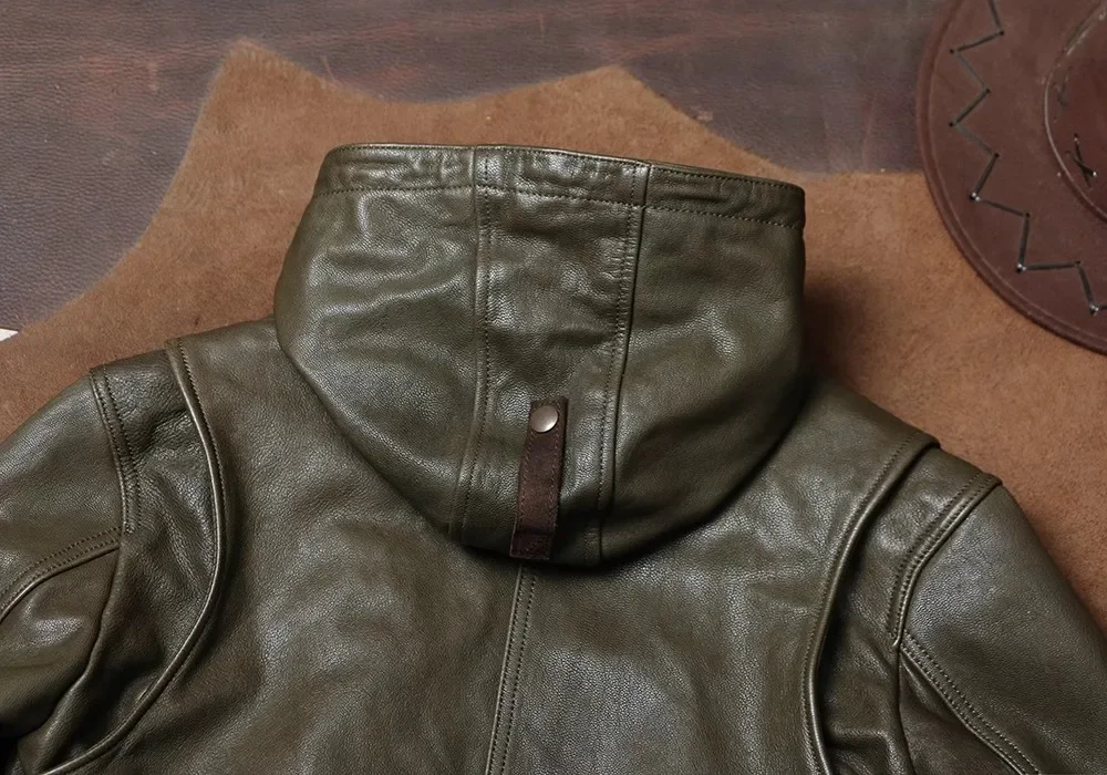 Men’s Luxury Goatskin Leather Hoodie – Heavy Real Goat Leather Vintage Army Green Hunting Jacket, Classic Outdoor Adventure Coat