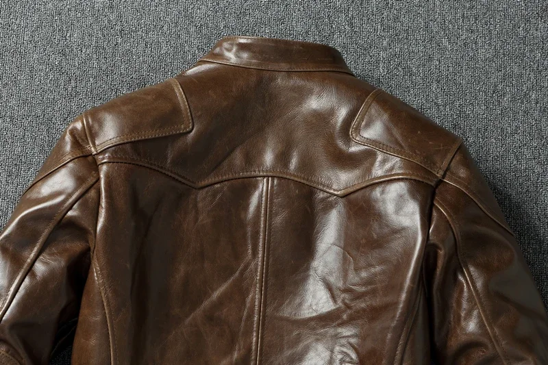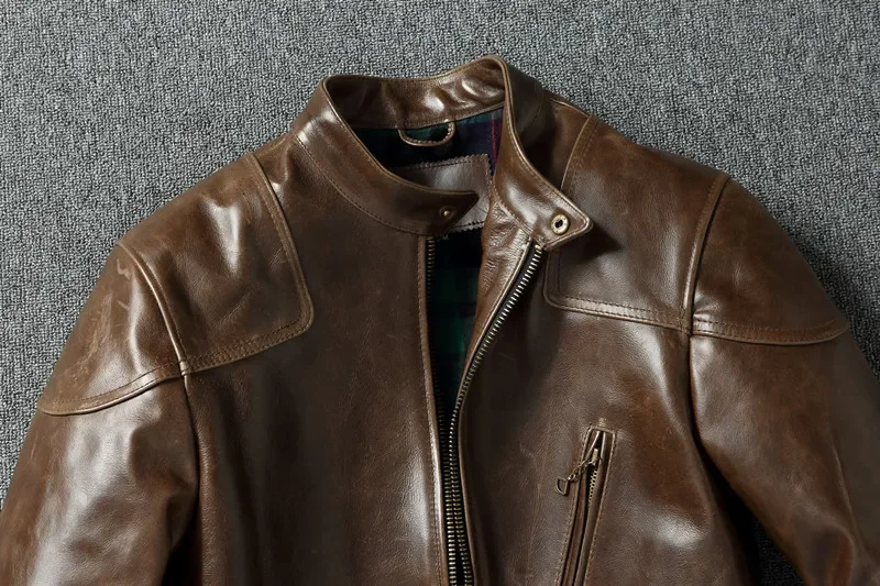 Men’s Oil-Waxed Cowhide Leather Jacket – RL Style Top-Layer Genuine Leather Biker Coat with Stand Collar, Brown Motorcycle Outerwear for Spring & Autumn