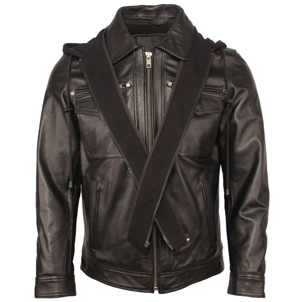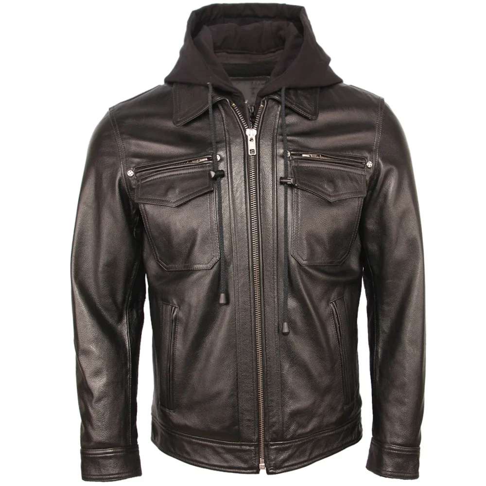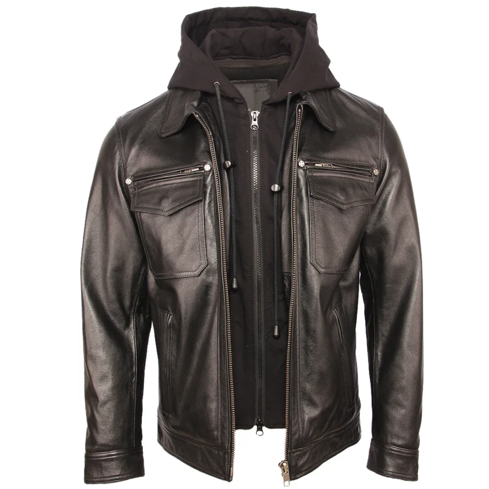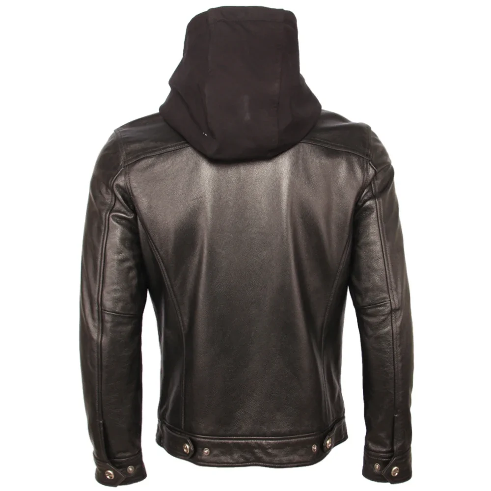 This jacket is crafted from 100% genuine cowhide leather, featuring a quilted inner lining and a detachable hood for versatile wear in any winter setting. The design offers superior warmth and durability while maintaining a sleek, modern silhouette. Perfect for both casual and outdoor occasions, this premium leather coat combines comfort, function, and timeless masculine style.