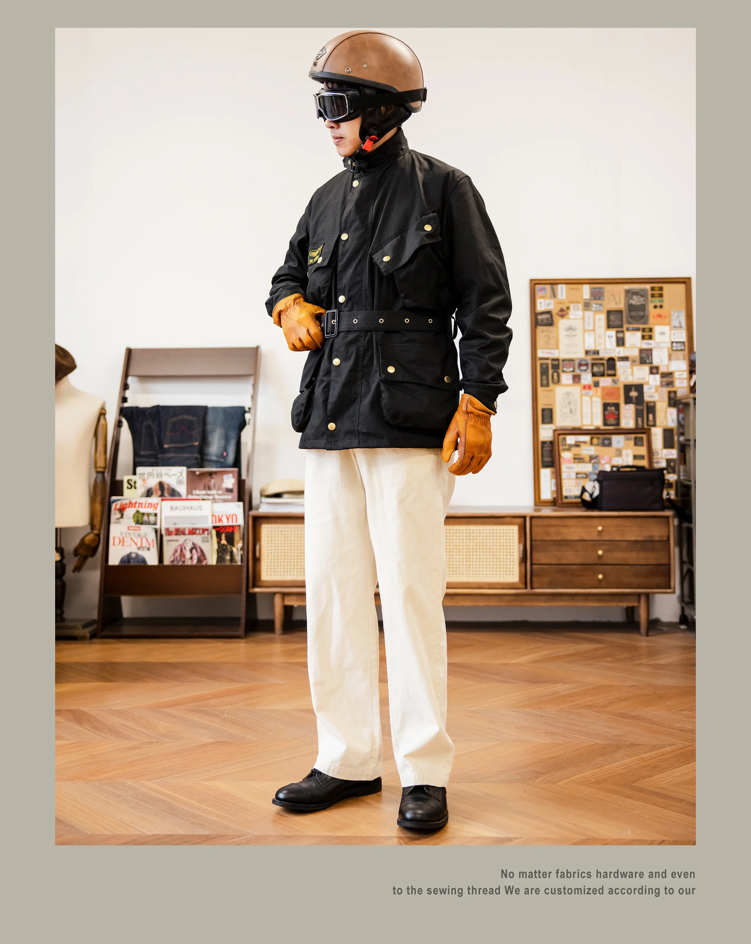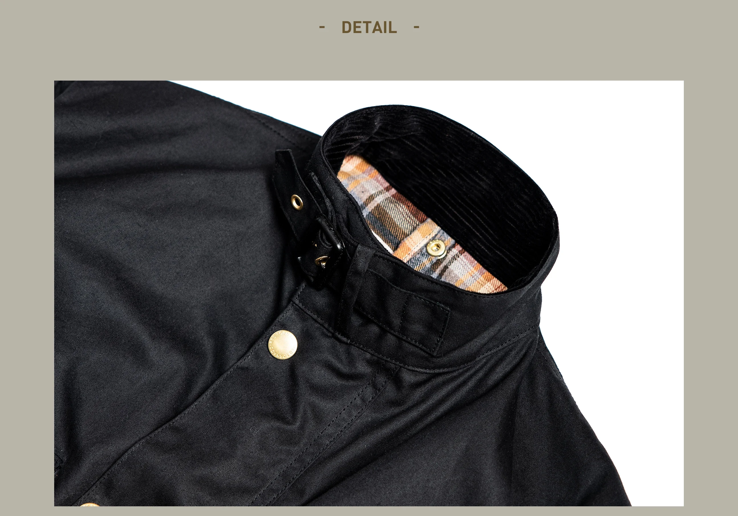 This jacket is crafted from high-density waterproof waxed cotton canvas, ensuring long-lasting wear and weather resistance.