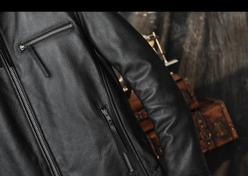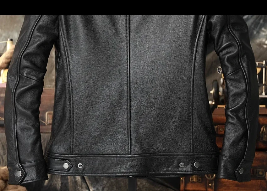 Crafted from 100% genuine top-layer cowhide, this men’s motorcycle jacket combines luxury craftsmanship with durability. The soft inner lining ensures comfort while the slim-fit cut highlights a modern silhouette. Ideal for both riding and casual wear, this jacket offers versatility, protection, and style for all seasons.