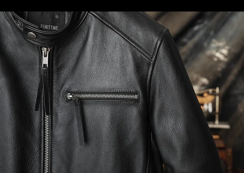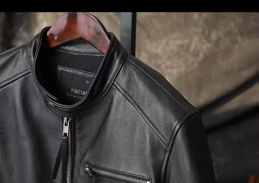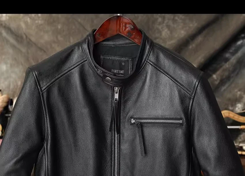 Men’s Slim Fit Genuine Cowhide Leather Motorcycle Jacket – Natural Real Leather Biker Coat for Spring & Autumn
