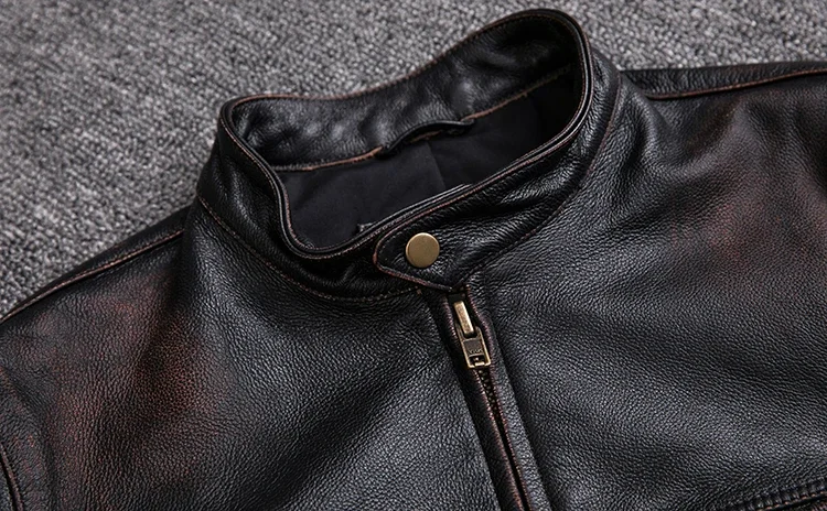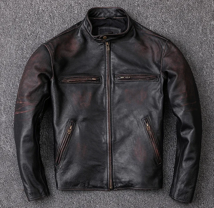 Men’s Vintage Distressed Calfskin Leather Jacket – Washed Stone-Milled 100% Natural Leather Coat in Black