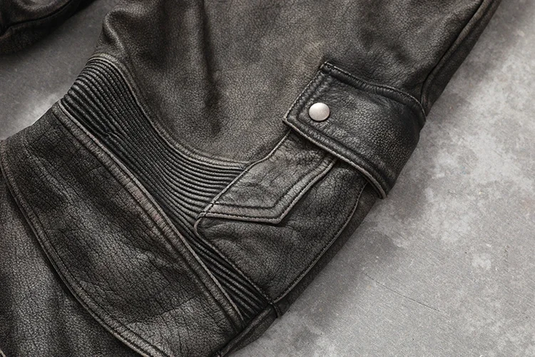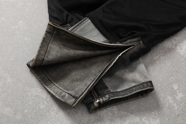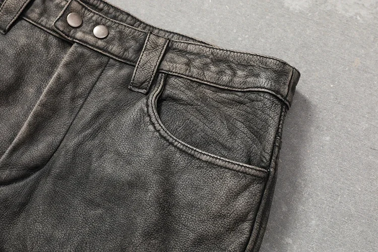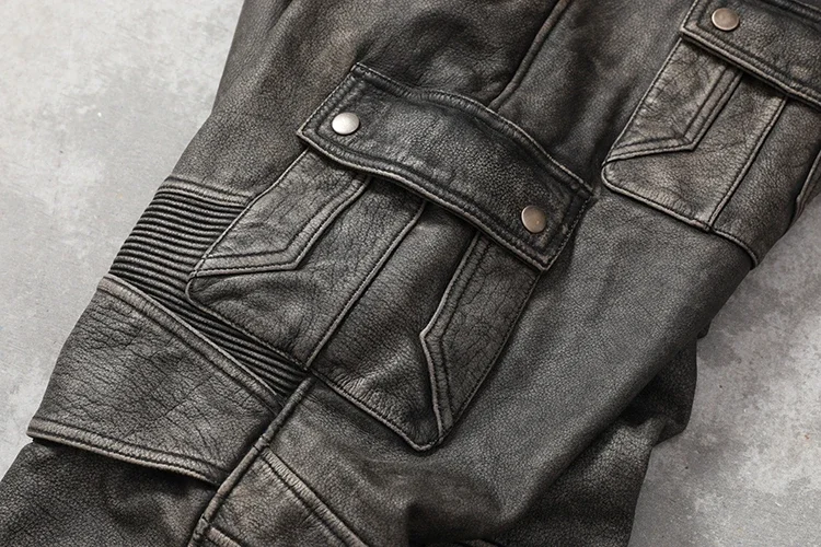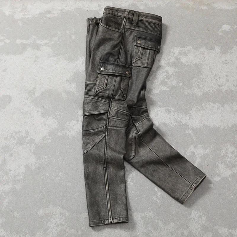 Men’s Vintage Gray Genuine Cowhide Leather Pants – Motorcycle Biker Real Leather Trousers, Autumn Winter Slim Fit Calça Masculina