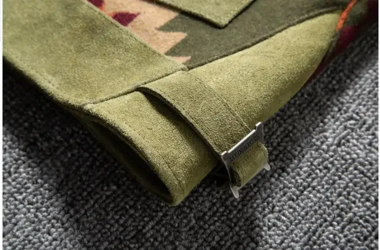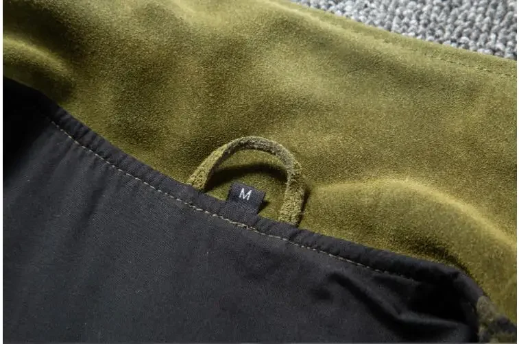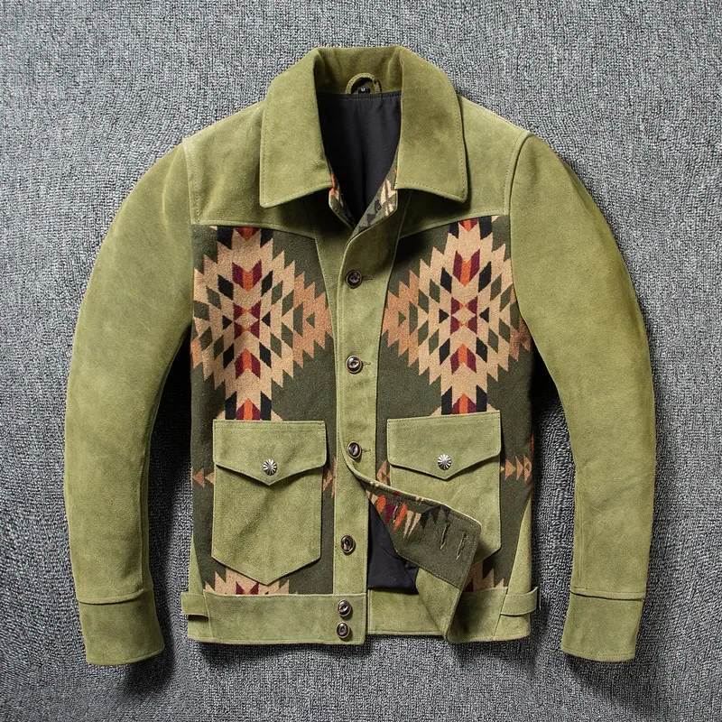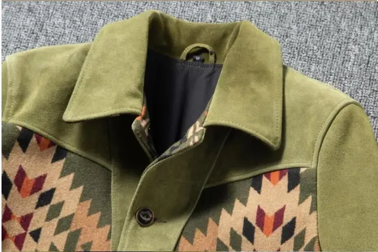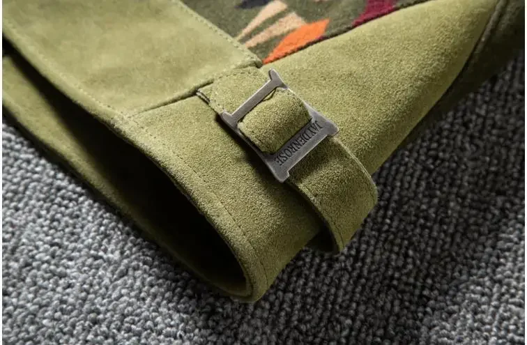Men’s Vintage Green Suede Leather Jacket – Casual Genuine Cowhide Coat with Canvas Stitching, 2025 Quality Fashion Brand Outerwear