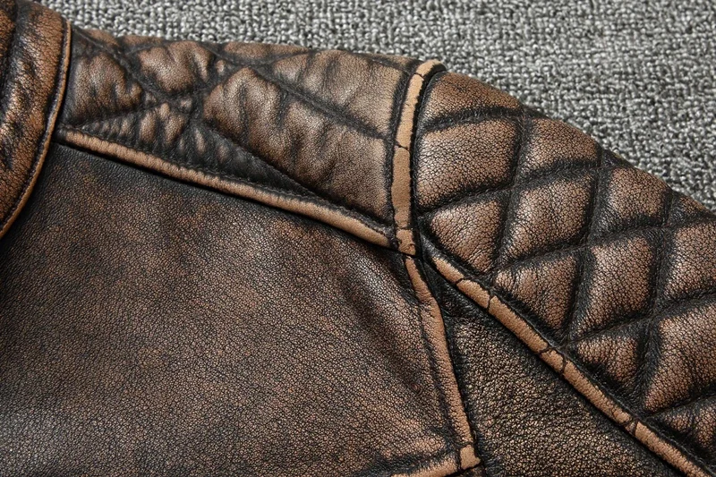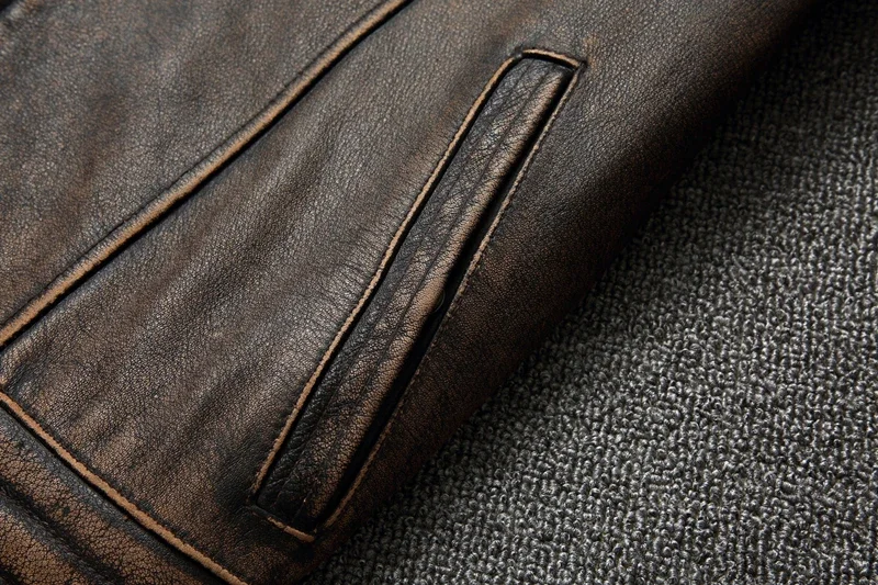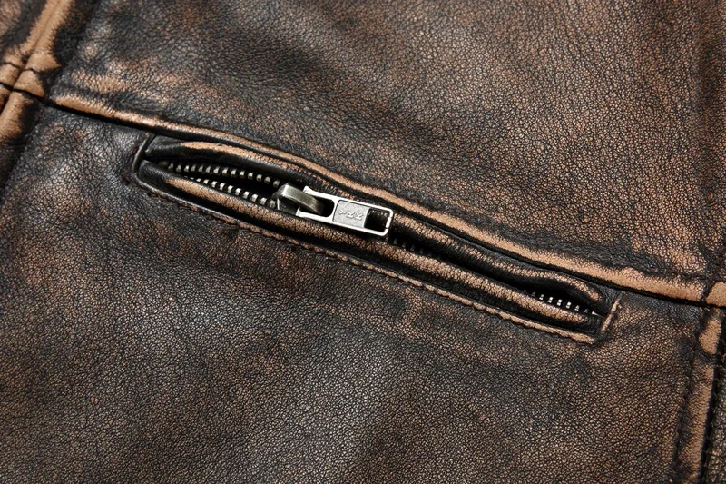 Men’s Vintage Motorcycle Jacket Stand Collar Natural Top Layer Cowhide Leather Biker Moto Suit