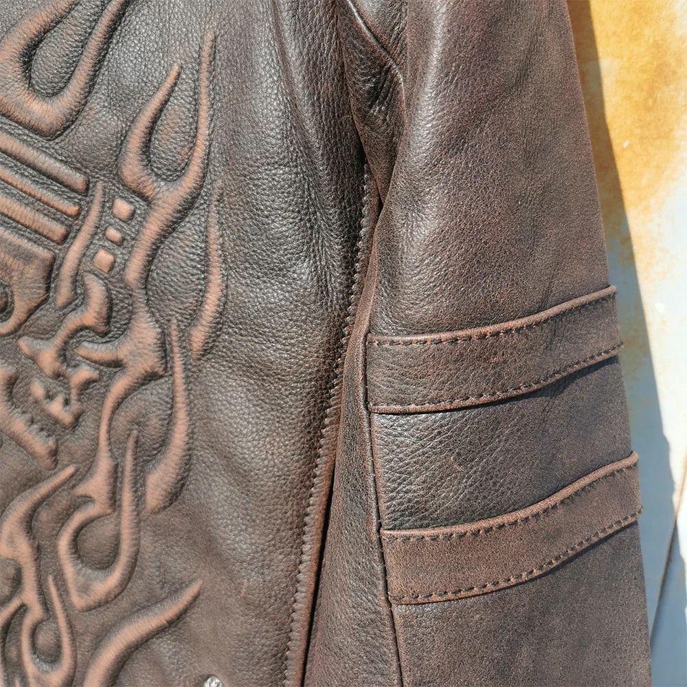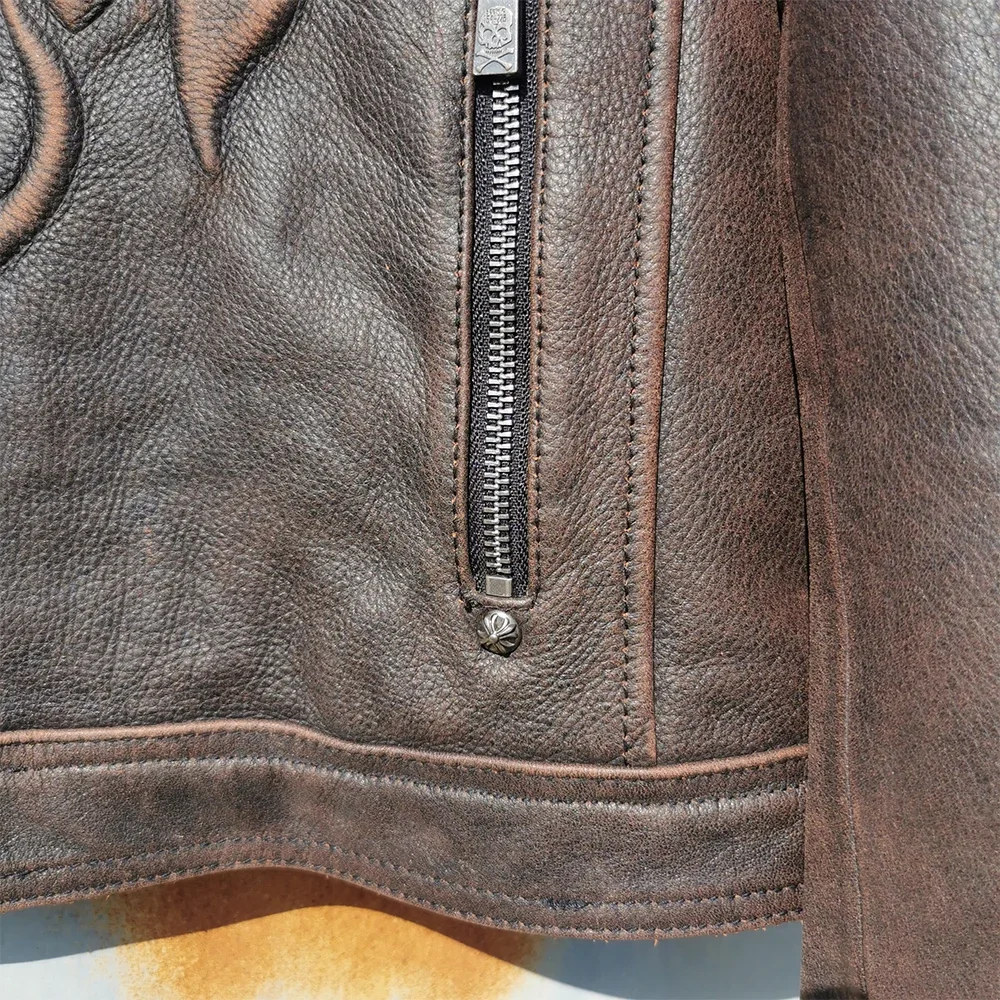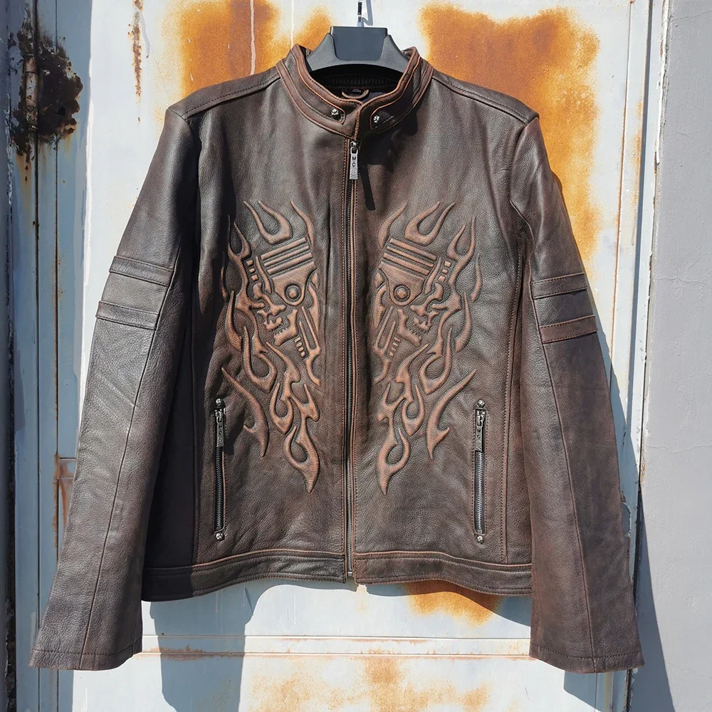 Men’s Vintage Motorcycle Leather Jacket – 100% Genuine Cowhide with 3D Skull Print, Natural Leather Biker Coat in Asian Size