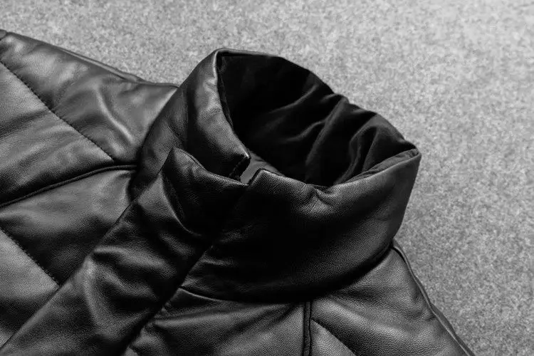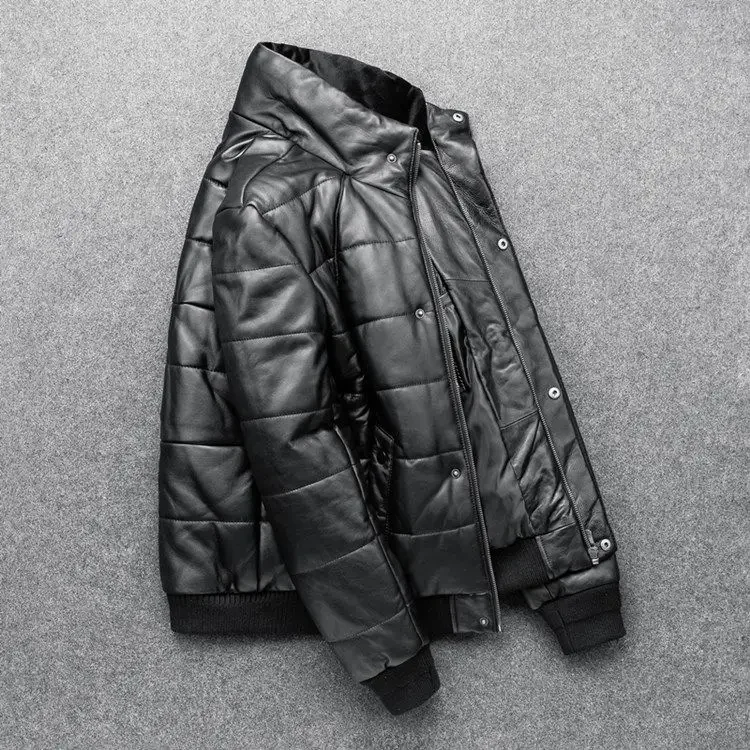 Men’s Winter Sheepskin Leather Down Jacket – Stand Collar Real Leather Coat with Cotton Padding | Warm Motorcycle Style