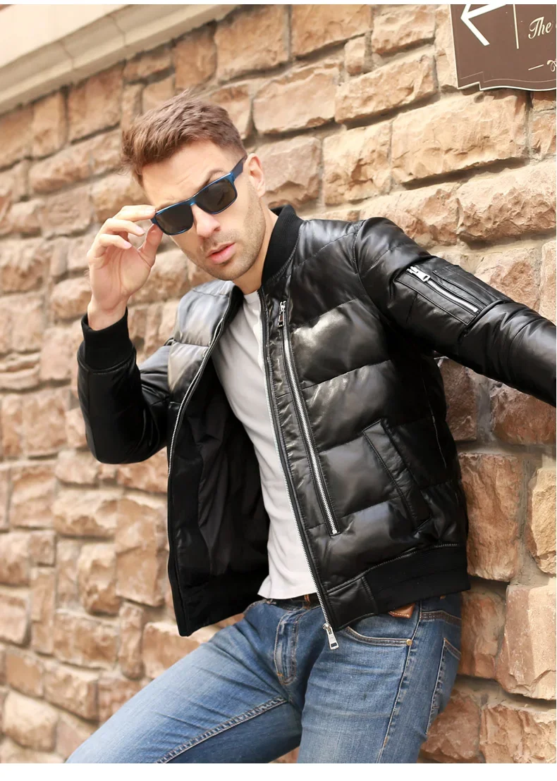 Men’s Winter Warm Sheepskin Leather Jacket 90% White Duck Down MA-1 Style Genuine Leather Coat