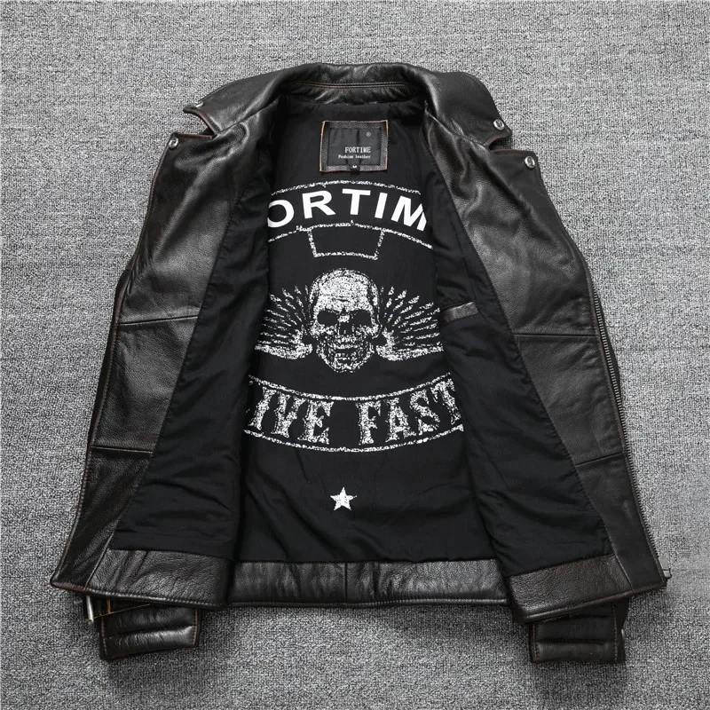 Oblique Zipper Vintage Brown Genuine Cowhide Leather Jacket – Men’s Slim Fit Biker Coat, Natural Real Leather Motorcycle Outerwear (2XL–5XL)